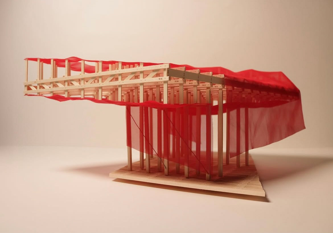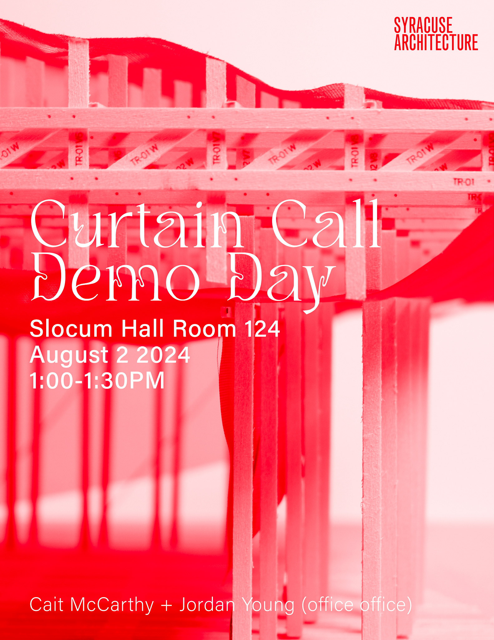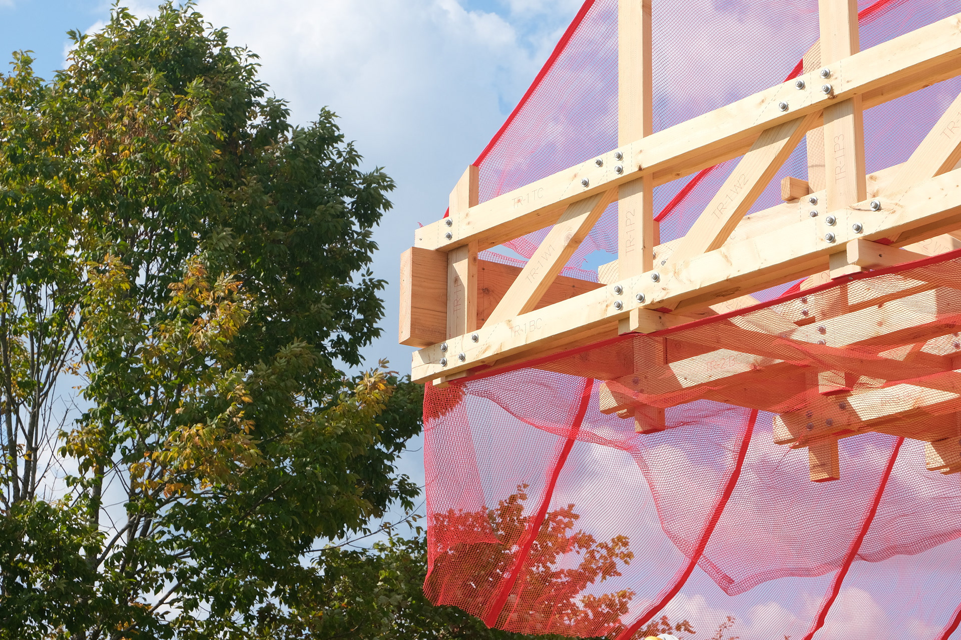 Curtain Call is a winning pavilion design for the 2024 BuildFest in Bethel, New York at the site of the 1969 Woodstock music festival. Aside from providing shade and shelter, the pavilion supports temporal uses such as lectures, gatherings, and performances. Designed by Jordan Young and Cait McCarthy of Office Office, the fabrication process utilizes a custom prototype machine, dubbed “Scribe 2.0”, to mark and measure construction details on dimensional lumber.