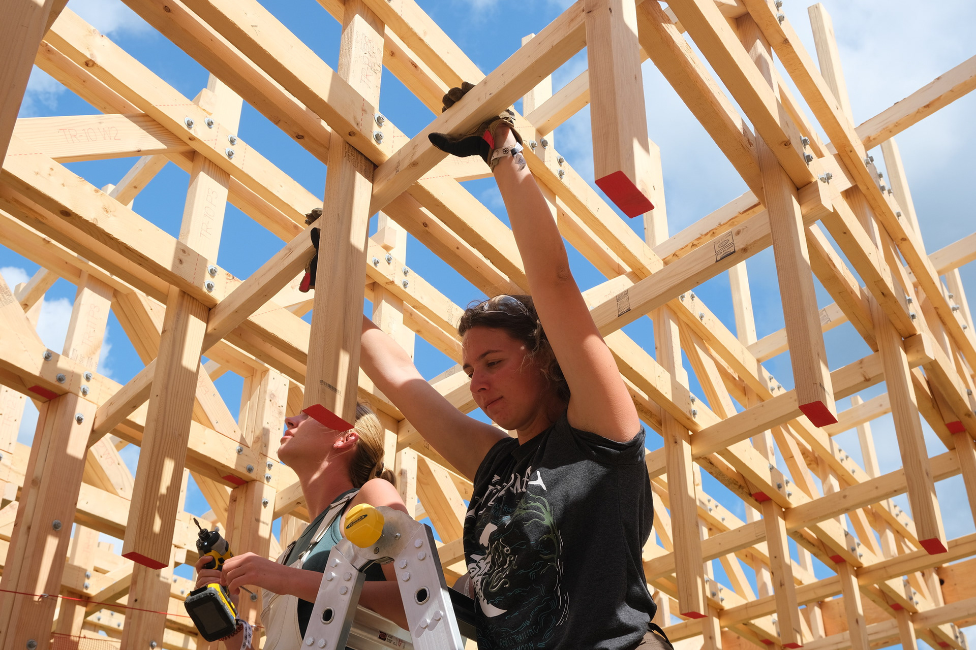 The shade structure references the original Woodstock stage and is supported by fifteen unique trusses which were fabricated off-site. Assembly took place on site over a period of 4 days. The robotic marking machine was transported to the site and used to finalize the drawn-on measurements needed for construction.