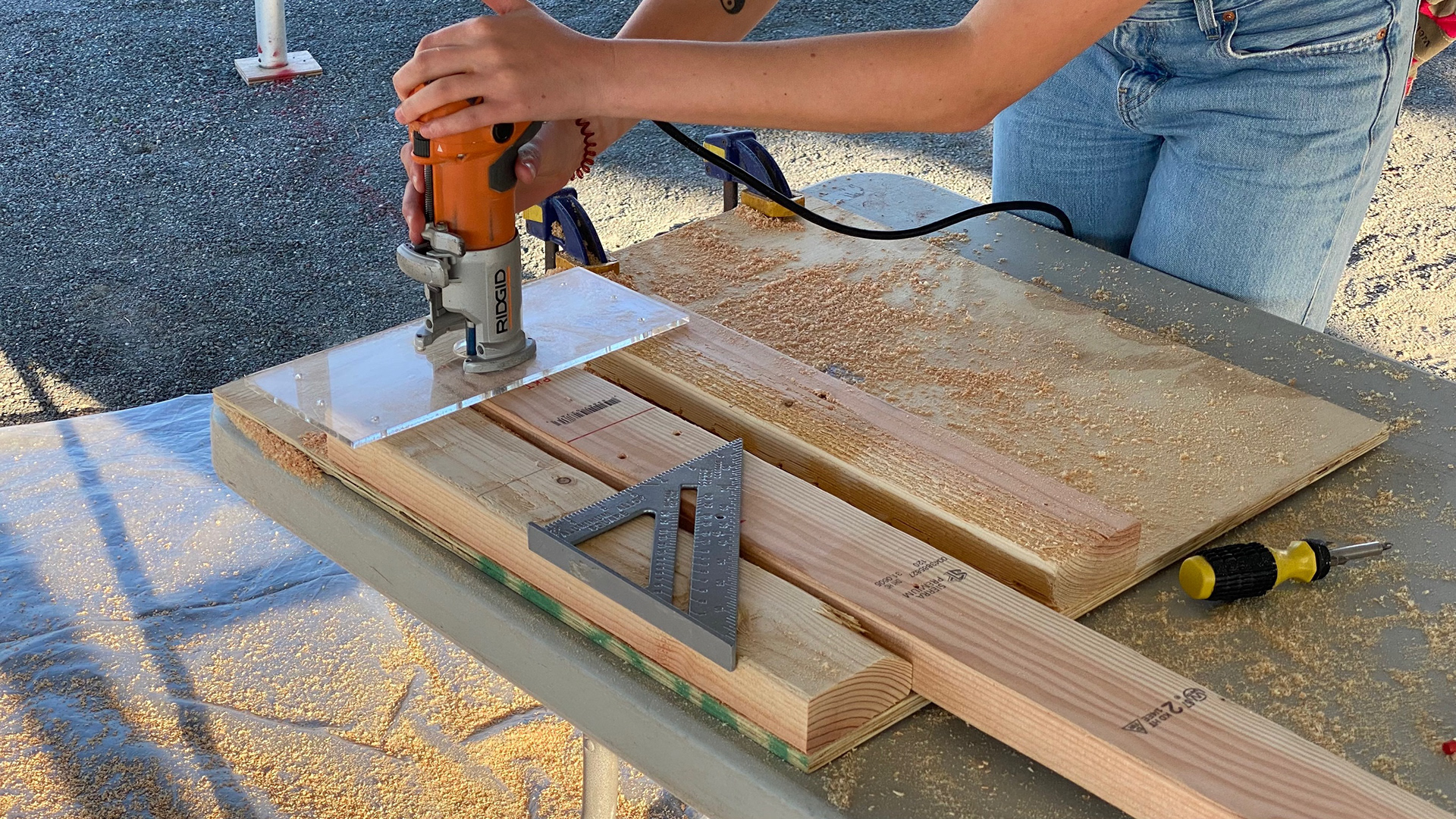 Scribe 2.0 reads g-code and works similar to a pen plotter, drawing lines, dashes, and letters on the 2x4s as they are fed through the machine.