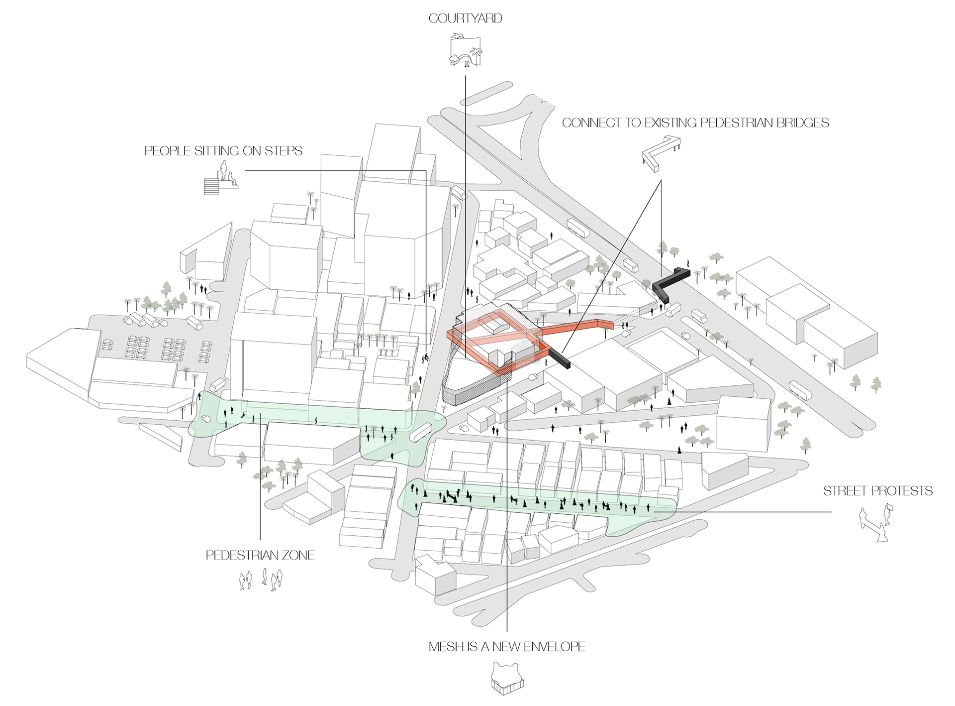 This proposal introduces a mural-lined, elevated pedestrian walkway intersecting with the existing building as well as an expanded metal mesh system that interacts to facilitate circulation within an urban network.