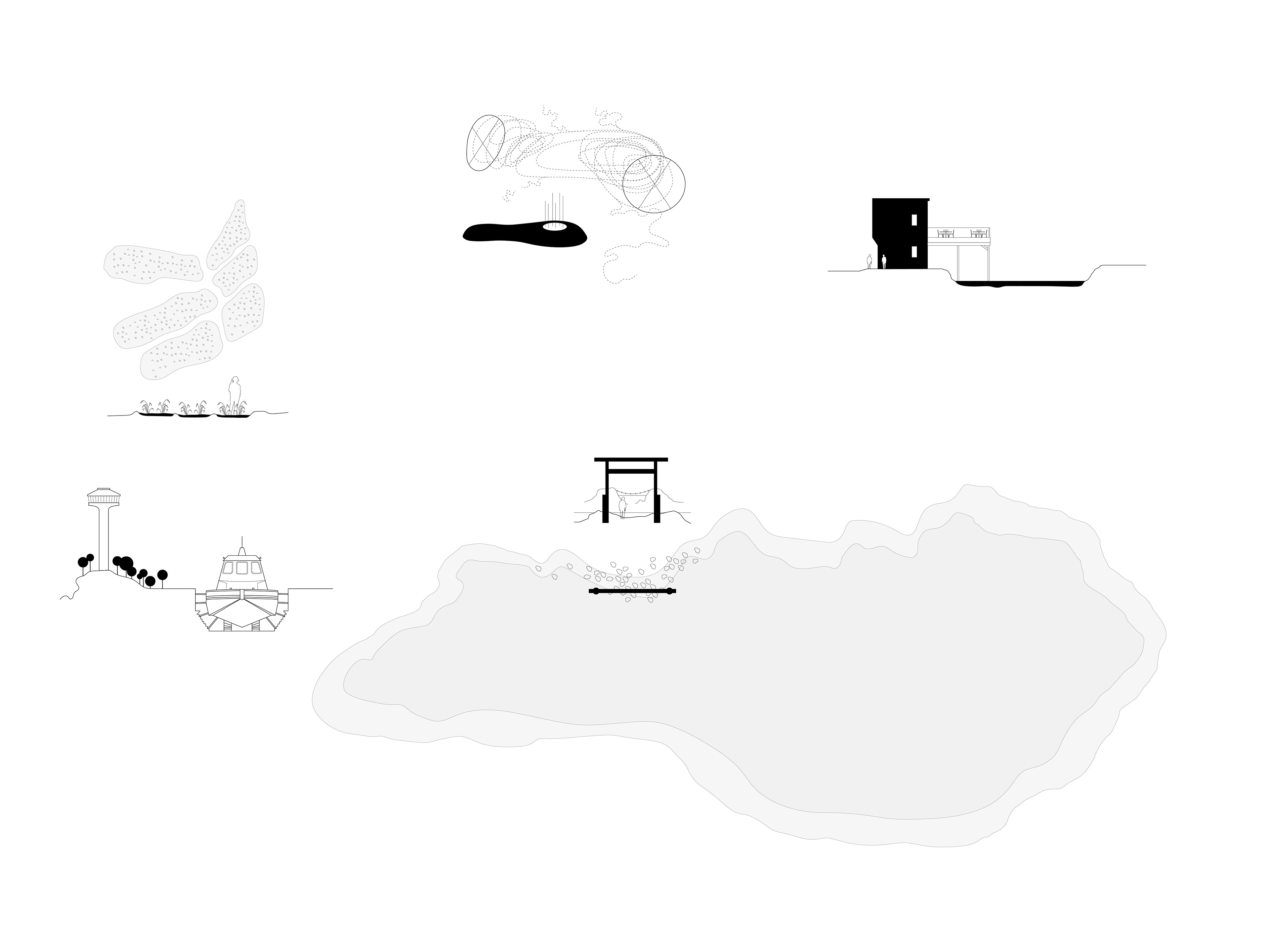 These illustrations are field studies from observations of interfaces between architecture and water in Japan and South Korea. Rice paddies on Teshima Island rely on consist flooding techniques to ensure sufficient water supply before harvest. The central artery of public space in Kyoto is the Kamo river. The accessible riverfront cultivates nightlife in the form of restaurants and bars overlooking the water. Tourists gather to take pictures at the Itoshima shrine, which frames a picturesque view of the ocean. The Teshima Art Museum features openings in its concrete shell to allow rainfall into the building, which then trickles to drains in the floor. The moving water creates a peaceful ambiance as visitors huddle on the ground to reconnect with nature. Yeongdo Island, home to the culture village of Kangkangee, relies on the shipbuilding and repair industry and involves infrastructure that accommodates large ships, such as drydocks and lighthouses.